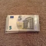 • 5 euros note has a holographic stripe on the right-hand side. When tilted, the stripe reveals the Euro symbol (€) and the value of the note (“5”). The hologram also shifts colors slightly, creating a dynamic effect.